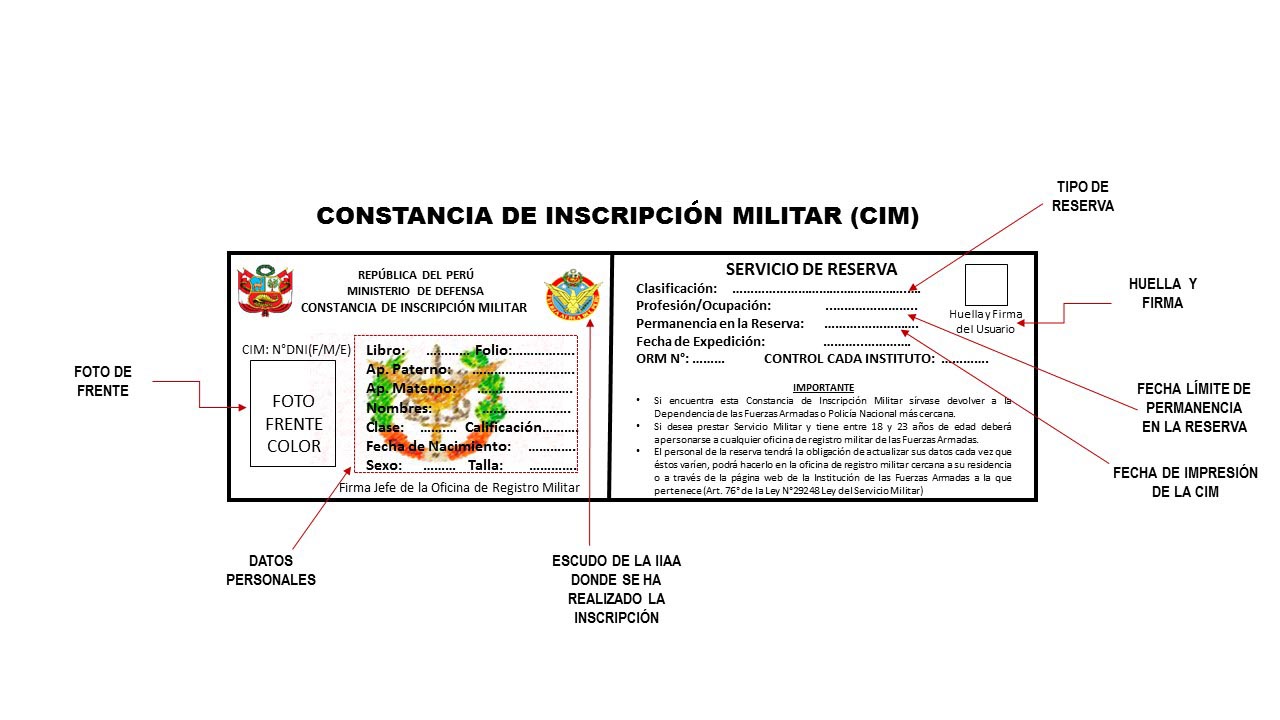 La Constancia de Inscripción Militar (CIM), es el documento que acredita la inscripción en los Registros Militares; será otorgada gratuitamente sólo al momento de la inscripción por las Oficinas de Registro Militar de las instituciones Armadas y los Consulados respectivos (Art. 30° de la Ley 29248 Ley del Servicio Militar), de acuerdo al siguiente formato: